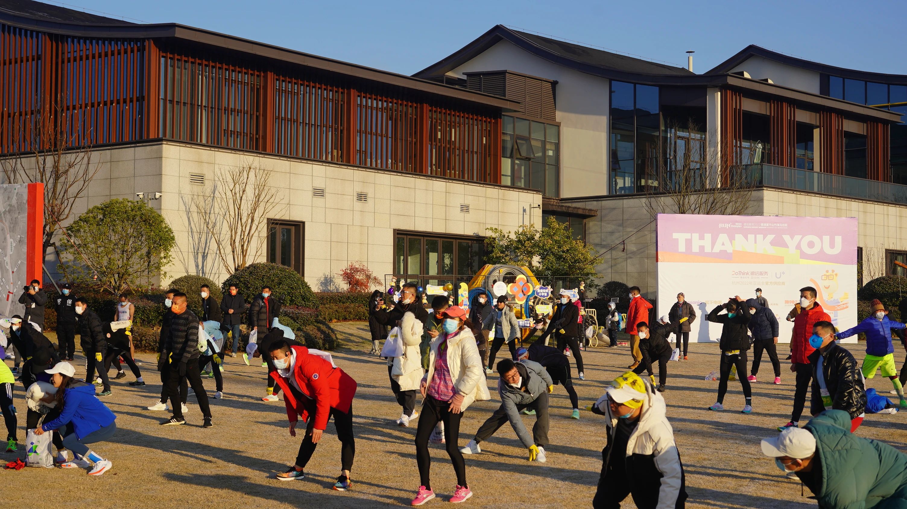 1000多名身形矫健的跑者,身着写有“青梅竹马”、“德信服务莫干山竹海马拉松专属运动装备,由专业教练带领下,集体进行简单的拉伸运动。